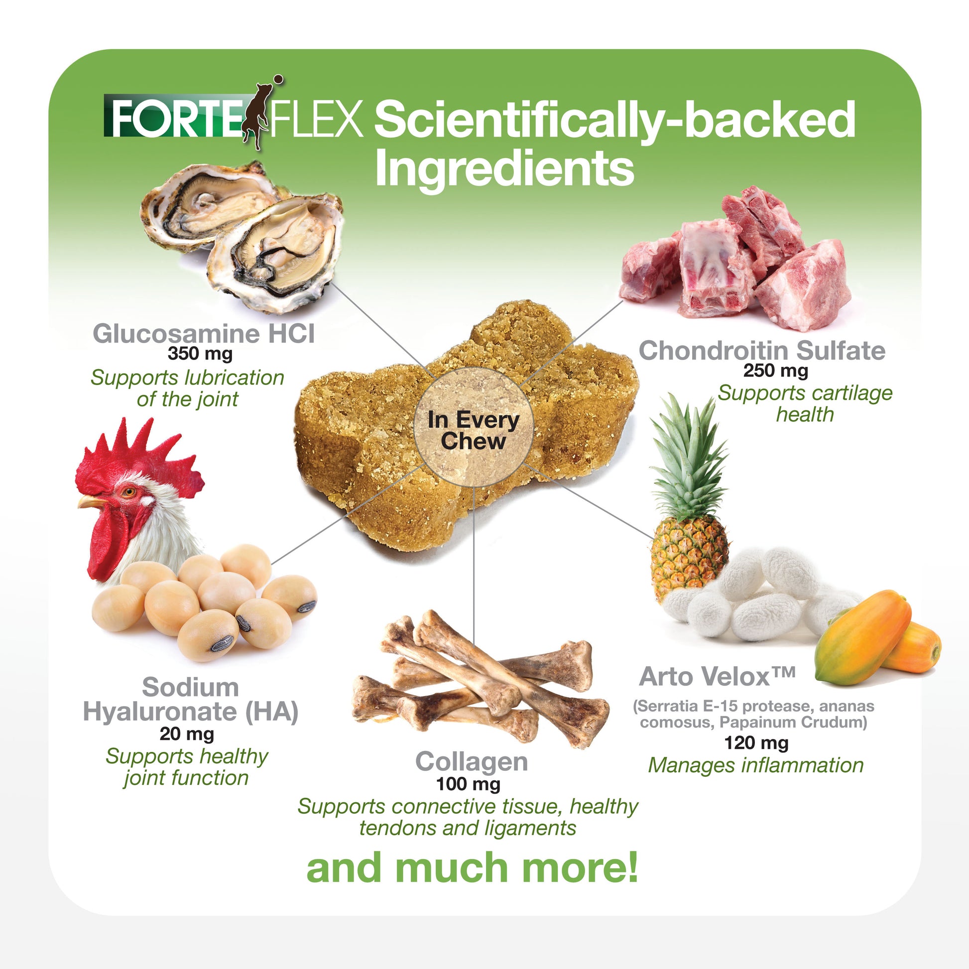 Powered by our proprietary Arto-Velox™ enzyme blend to help regulate the inflammation cycle, Forte Flex also delivers glucosamine, chondroitin, collagen, hyaluronic acid (HA) and more to support: